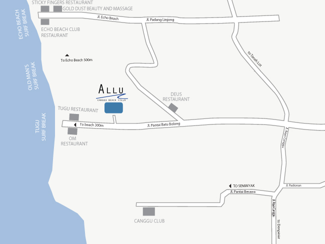 Villa Allu Canggu is perfectly located 500 meteres from Canggu beach which features amazing surf for experienced to beginners and waves suited to both long and short boards. Within 100m we have some of Canggus best restaurants including Mason, Lacalita and Milk and Madu Beach Road. We also have within 200m an F45 gym and a beautiful yoga studio named The Practice. Shops surround the Villa and are within easy walking distance